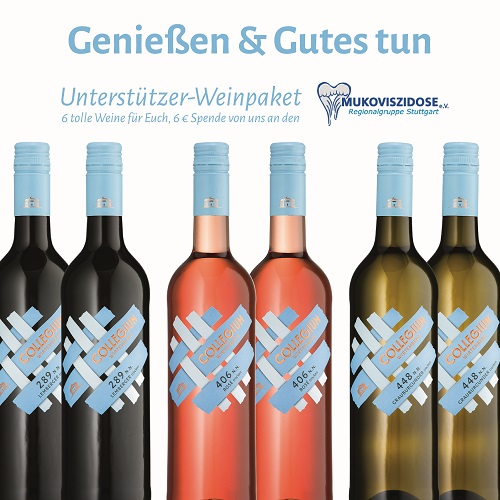 Pro bis 31.10. verkauftem 6er Paket (2x 289 n.n. Lemberger, 2x 406 n.n. Rosé, 2x 448 n.n. Grauburgunder für 39 €) spenden wir 6 € an die Mukoviszidose e.V. Stuttgarter Regionalgruppe und schenken Euch zusätzlich die Versandkosten.*